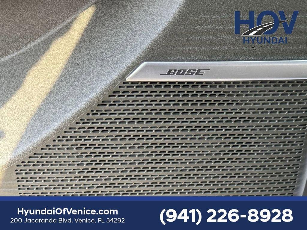 - Radio: AM/FM/HD Bose Premium Audio System -inc: 12 speakers including subwoofer, external amplifier, 12.3" wide touchscreen, Apple CarPlay and Android Auto, Bluetooth® hands-free w/wireless audio streaming, dynamic voice recognition, USB connectivity, SiriusXM, Blue Link+ connected car system, navigation system including traffic flow w/incident data via HD Radio (HERE) and rear seat quiet mode