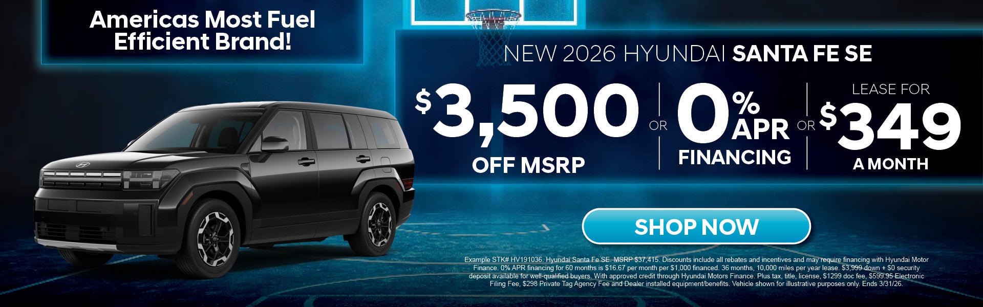 Example STK# HV191036. Hyundai Santa Fe SE. MSRP $37,415. Discounts include all rebates and incentives and may require financing with Hyundai Motor Finance. 0% APR financing for 60 months is $16.67 per month per $1,000 financed. 36 months, 10,000 miles per year lease. $3,999 down + $0 security deposit available for well-qualified buyers. With approved credit through Hyundai Motors Finance. Plus tax, title, license, $1299 doc fee, $599.95 Electronic Filing Fee, $298 Private Tag Agency Fee and Dealer installed equipment/benefits. Vehicle shown for illustrative purposes only.
