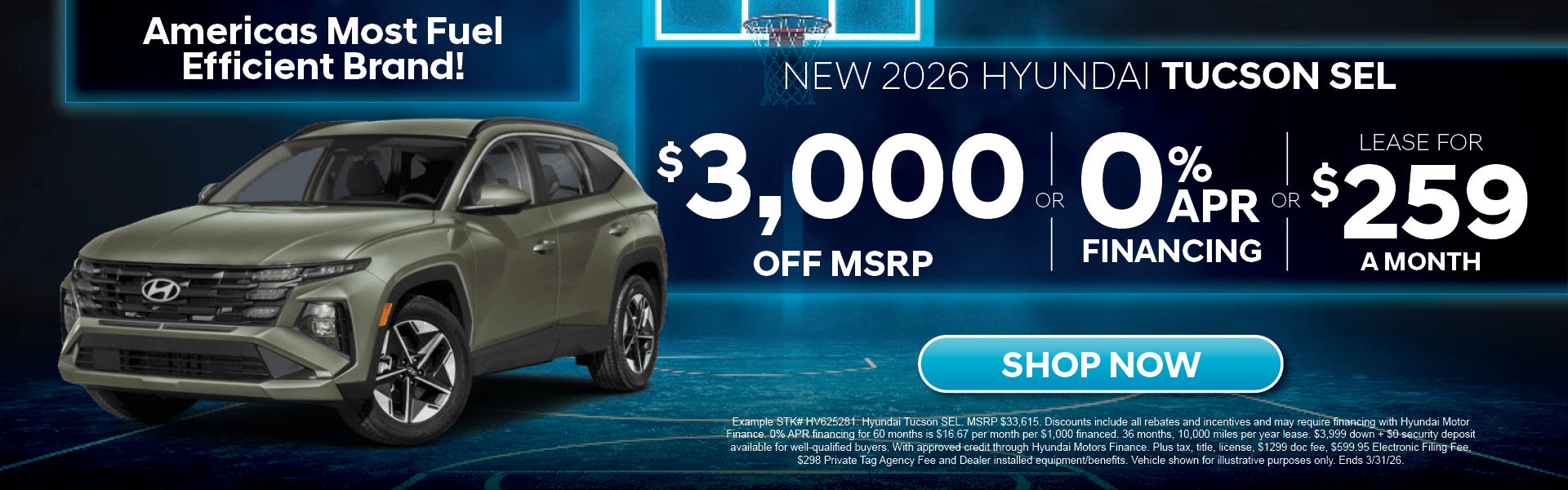 Example STK# HV625281. Hyundai Tucson SEL. MSRP $33,615. Discounts include all rebates and incentives and may require financing with Hyundai Motor Finance. 0% APR financing for 60 months is $16.67 per month per $1,000 financed. 36 months, 10,000 miles per year lease. $3,999 down + $0 security deposit available for well-qualified buyers. With approved credit through Hyundai Motors Finance. Plus tax, title, license, $1299 doc fee, $599.95 Electronic Filing Fee, $298 Private Tag Agency Fee and Dealer installed equipment/benefits. Vehicle shown for illustrative purposes only.
