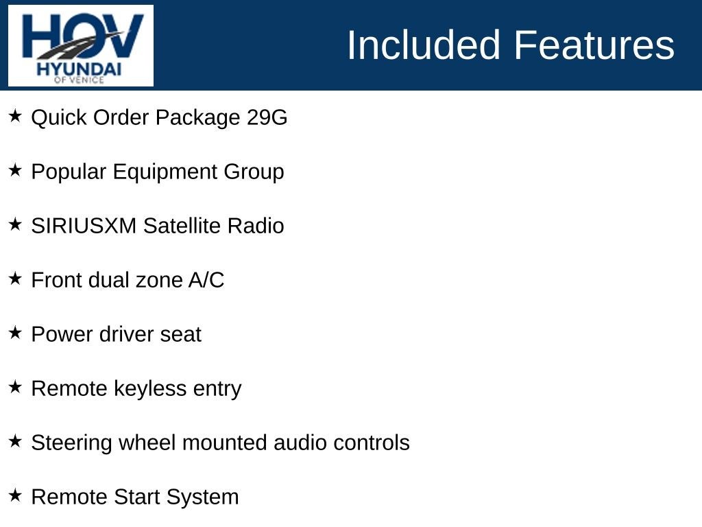 All pricing assumes dealer arranged financing on approved credit. Hyundai of Venice Platinum Protection Plan of $1,295 and $995 CPO Inspection charge (CPO Units only) is not included. Hyundai of Venice also offers various programs periodically, which are mutually exclusive and cannot be combined with other offers. A Dealer Fee of $1299.00, Electronic Titling Fee of $599.95, Private Tag Agency fee of $298.00, and applicable taxes, tags, and government fees are not included in the listed prices. While we strive to represent each vehicle accurately, including color, equipment, and options, we recommend verifying all details before purchase, as we are not liable for errors or omissions. To receive any advertised pricing or specials, a copy of the advertisement must be presented at the time of purchase.