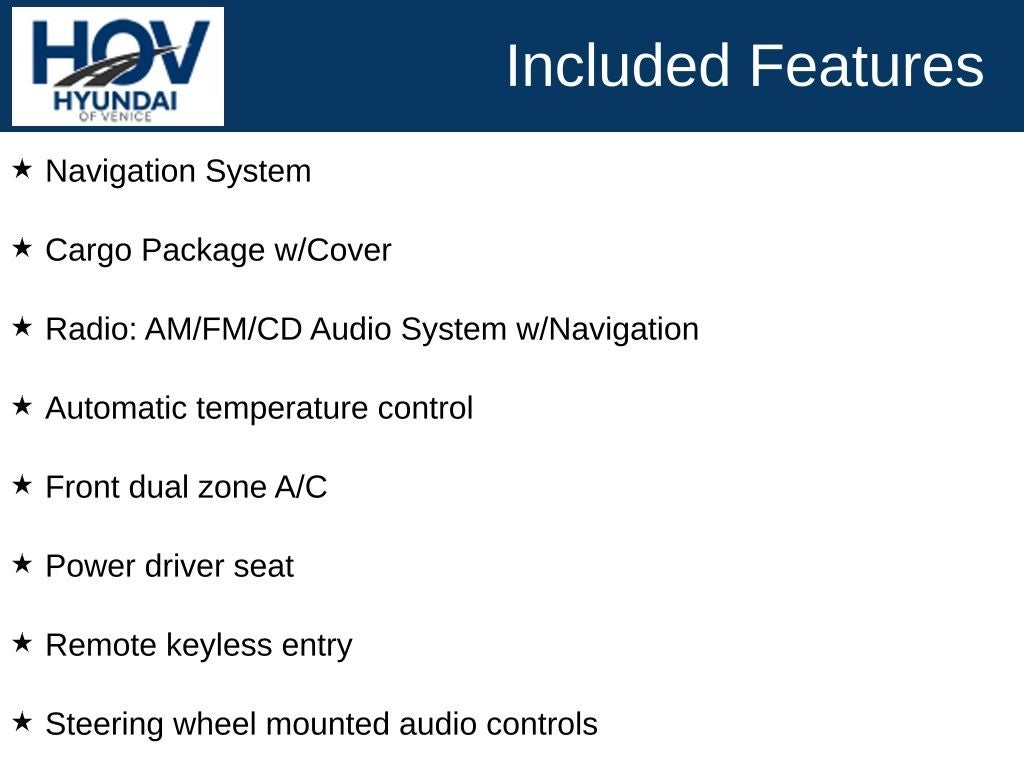 Visit our website at www.hyundaiofvenice.com for full pricing disclosures including required fees. Our vehicles are priced using current market conditions and available manufacturer incentives to provide competitive, transparent pricing and include destination and handling and unless otherwise indicated, advertised prices INCLUDE $1,299 dealer fee, $599.95 electronic filing fee. $298 private tag agency fee, Tax, tag, title, registration are excluded. Optional dealer-installed products, including the Hyundai of Venice Platinum Protection Plan ($1,295), are not included in the advertised price unless otherwise stated and are always optional. Retired Loaners pricing may reflect available incentives or programs from Hyundai Motor Finance. Not all customers will qualify, and offers may not be combined. Please contact the dealership for complete details and eligibility requirements. While we make every effort to ensure accuracy in vehicle descriptions, pricing, equipment, and availability, we recommend verifying all information with a member of our team prior to purchase, as errors or omissions may occur. All vehicles are offered for immediate sale and are sold on a first-come, first-served basis. Due to high demand, we do not hold used vehicles with deposits. To ensure eligibility for any advertised price or promotion, please refer to the specific advertisement at the time of purchase.