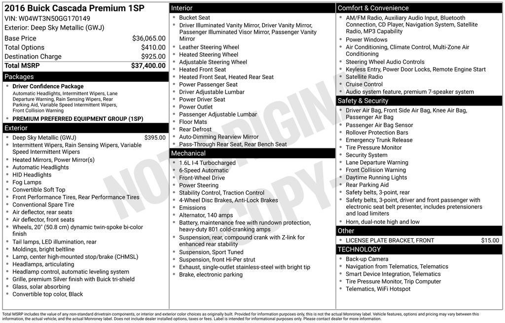Deep Sky Metallic 2016 Buick Cascada Premium Clean CARFAX.