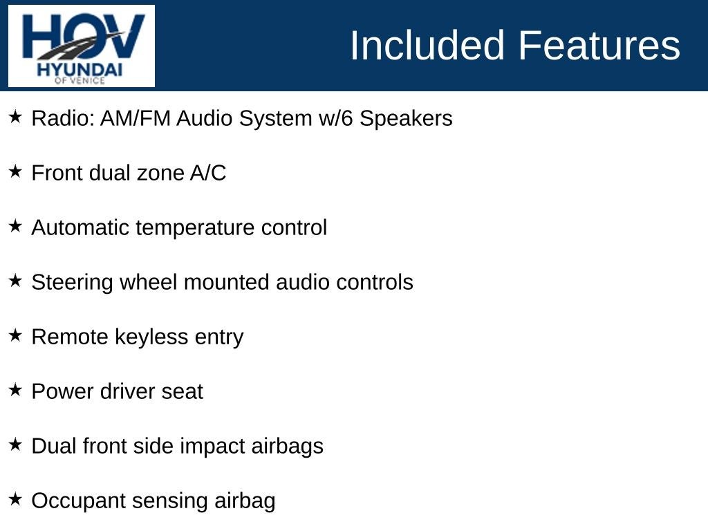 All pricing assumes dealer arranged financing on approved credit. Hyundai of Venice Platinum Protection Plan of $1,295 and $995 CPO Inspection charge (CPO Units only) is not included. Hyundai of Venice also offers various programs periodically, which are mutually exclusive and cannot be combined with other offers. A Dealer Fee of $1299.00, Electronic Titling Fee of $599.95, Private Tag Agency fee of $298.00, and applicable taxes, tags, and government fees are not included in the listed prices. While we strive to represent each vehicle accurately, including color, equipment, and options, we recommend verifying all details before purchase, as we are not liable for errors or omissions. To receive any advertised pricing or specials, a copy of the advertisement must be presented at the time of purchase.