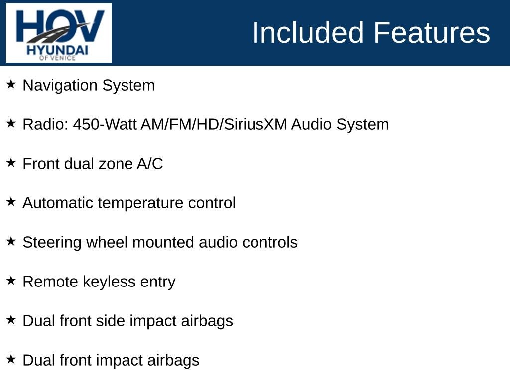 All pricing assumes dealer arranged financing on approved credit. Hyundai of Venice Platinum Protection Plan of $1,295 and $995 CPO Inspection charge (CPO Units only) is not included. Hyundai of Venice also offers various programs periodically, which are mutually exclusive and cannot be combined with other offers. A Dealer Fee of $1299.00, Electronic Titling Fee of $599.95, Private Tag Agency fee of $298.00, and applicable taxes, tags, and government fees are not included in the listed prices. While we strive to represent each vehicle accurately, including color, equipment, and options, we recommend verifying all details before purchase, as we are not liable for errors or omissions. To receive any advertised pricing or specials, a copy of the advertisement must be presented at the time of purchase.