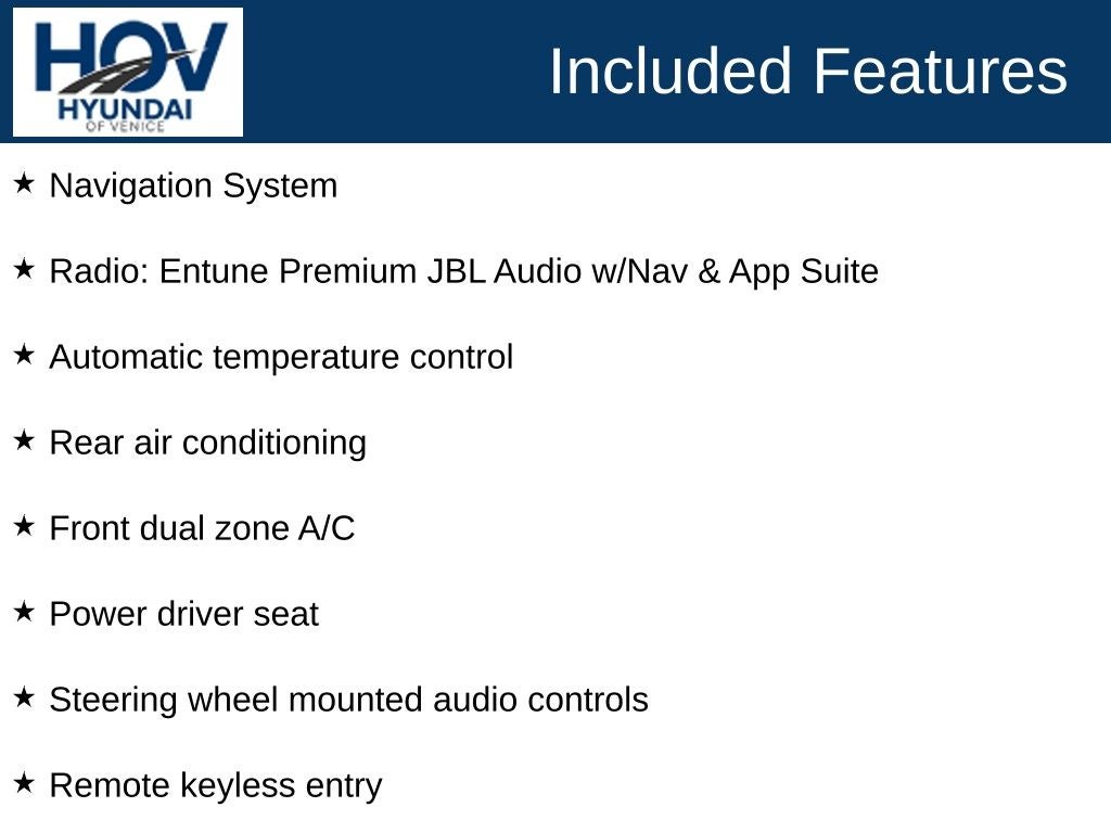 All pricing assumes dealer arranged financing on approved credit. Hyundai of Venice Platinum Protection Plan of $1,295 and $995 CPO Inspection charge (CPO Units only) is not included. Hyundai of Venice also offers various programs periodically, which are mutually exclusive and cannot be combined with other offers. A Dealer Fee of $1299.00, Electronic Titling Fee of $599.95, Private Tag Agency fee of $298.00, and applicable taxes, tags, and government fees are not included in the listed prices. While we strive to represent each vehicle accurately, including color, equipment, and options, we recommend verifying all details before purchase, as we are not liable for errors or omissions. To receive any advertised pricing or specials, a copy of the advertisement must be presented at the time of purchase.
