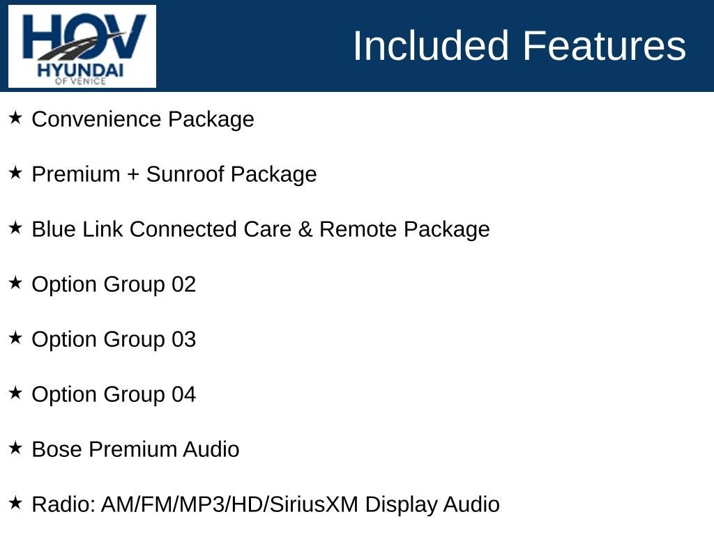 All pricing assumes dealer arranged financing on approved credit. Retired Loaner Vehicle pricing may include all factory rebates and incentives.. Hyundai of Venice Platinum Protection Plan of $1,295 and $995 CPO Inspection charge (CPO Units only) is not included. Hyundai of Venice also offers various programs periodically, which are mutually exclusive and cannot be combined with other offers. A Dealer Fee of $1299.00, Electronic Titling Fee of $599.95, Private Tag Agency fee of $298.00, and applicable taxes, tags, and government fees are not included in the listed prices. While we strive to represent each vehicle accurately, including color, equipment, and options, we recommend verifying all details before purchase, as we are not liable for errors or omissions. To receive any advertised pricing or specials, a copy of the advertisement must be presented at the time of purchase. All prices are for immediate sale and vehicles are sold first come first served. We do not accept deposits to hold used vehicles.