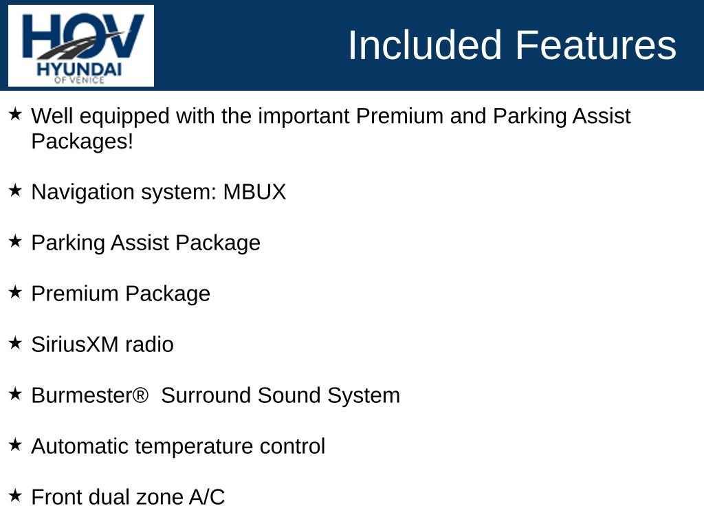 All pricing assumes dealer arranged financing on approved credit. Retired Loaner Vehicle pricing may include all factory rebates and incentives.. Hyundai of Venice Platinum Protection Plan of $1,295 and $995 CPO Inspection charge (CPO Units only) is not included. Hyundai of Venice also offers various programs periodically, which are mutually exclusive and cannot be combined with other offers. A Dealer Fee of $1299.00, Electronic Titling Fee of $599.95, Private Tag Agency fee of $298.00, and applicable taxes, tags, and government fees are not included in the listed prices. While we strive to represent each vehicle accurately, including color, equipment, and options, we recommend verifying all details before purchase, as we are not liable for errors or omissions. To receive any advertised pricing or specials, a copy of the advertisement must be presented at the time of purchase. All prices are for immediate sale and vehicles are sold first come first served. We do not accept deposits to hold used vehicles.