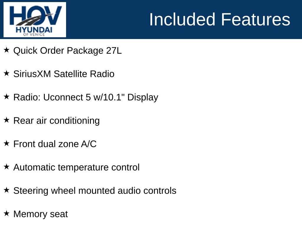 All pricing assumes dealer arranged financing on approved credit. Retired Loaner Vehicle pricing may include all factory rebates and incentives.. Hyundai of Venice Platinum Protection Plan of $1,295 and $995 CPO Inspection charge (CPO Units only) is not included. Hyundai of Venice also offers various programs periodically, which are mutually exclusive and cannot be combined with other offers. A Dealer Fee of $1299.00, Electronic Titling Fee of $599.95, Private Tag Agency fee of $298.00, and applicable taxes, tags, and government fees are not included in the listed prices. While we strive to represent each vehicle accurately, including color, equipment, and options, we recommend verifying all details before purchase, as we are not liable for errors or omissions. To receive any advertised pricing or specials, a copy of the advertisement must be presented at the time of purchase. All prices are for immediate sale and vehicles are sold first come first served. We do not accept deposits to hold used vehicles.