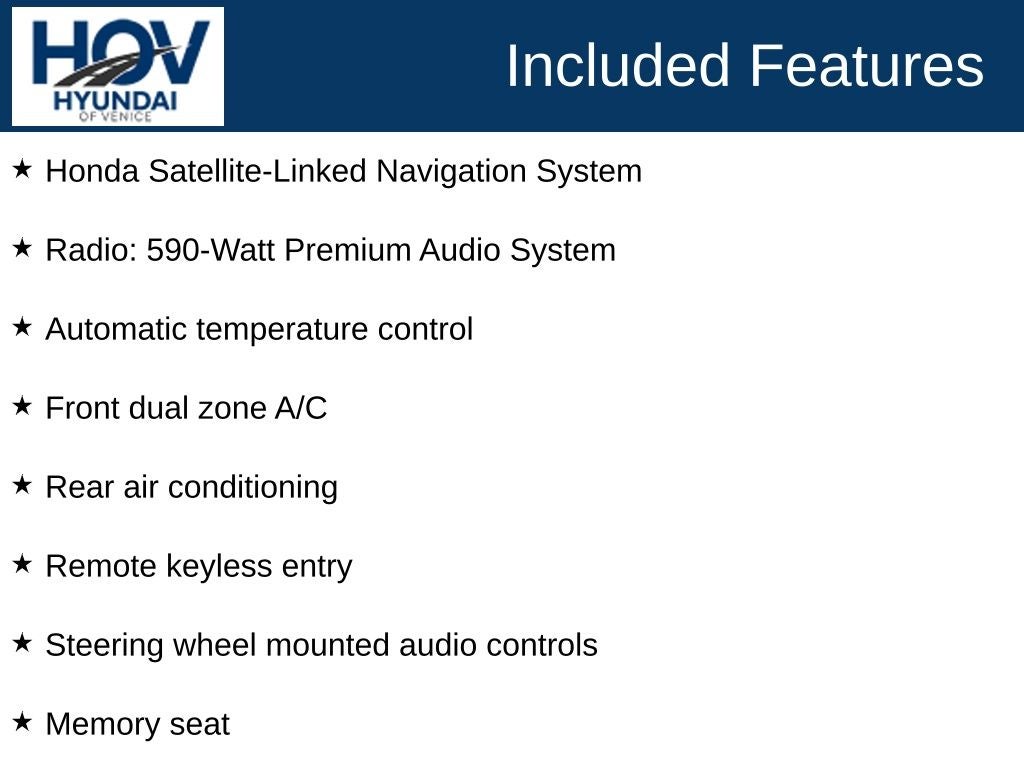 - Radio: 590-Watt Premium Audio System -inc: 10 speakers, subwoofer, 8" display audio w/high-resolution electrostatic touch-screen and customizable feature settings, 2.5-amp USB smartphone/audio interface front console (1 port), Bluetooth® HandsFreeLink, Bluetooth® streaming audio, MP3/auxiliary input jack, Radio Data System (RDS), Speed-Sensitive Volume Compensation (SVC), 2.5-amp USB charging port in center console (1 port) and 2nd row (2 ports), HondaLink, CabinControl remote compatibility, Apple CarPlay integration, Android Auto integration, SMS text message function (Compatible w/select phones w/Bluetooth®, Your wireless carrier's rate plans apply, State or local laws may limit use of texting feature, Only use texting feature when conditions allow you to do so safely.), SiriusXM radio (SiriusXM services require a subscription after any trial period, If you decide to continue your SiriusXM service at the end of your trial subscription, the plan you choose will automatically renew and bill at then-current rates until you call SiriusXM at 1-866-635-2349 to cancel, See our customer agreement for complete terms at www.siriusxm.com, Fees and programming subject to change, Available in the 48 contiguous United States and D.C, SiriusXM and all related marks and logos are trademarks of SiriusXM Radio Inc, HD Radio, CabinTalk in-car PA system through speakers and headphones, HondaLink subscription services (HondaLink subscription services come w/complimentary trials of security for 1 year and a remote/concierge trial for 3 months, Enrollment is required to access the remote/concierge trial and to access certain features of security, At the end of each trial period, purchase of a subscription is required to continue the respective services.), Wi-Fi hotspot capability (Requires AT&T data plan.) and multi-zone audio