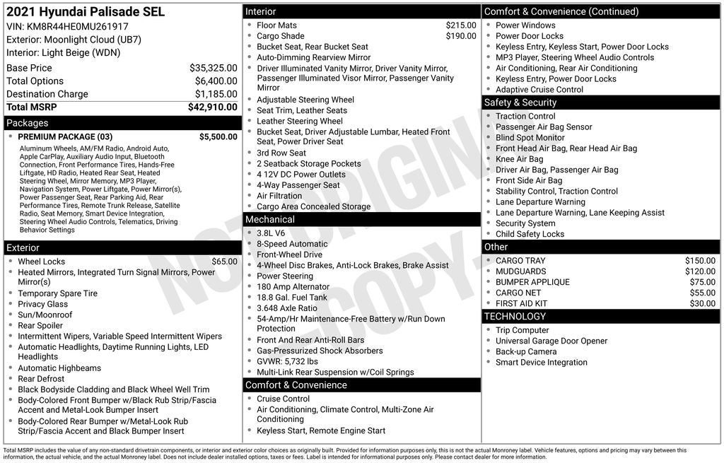 Certified. Moonlight Cloud 2021 Hyundai Palisade SEL WITH PREMIUM PACKAGE! ($5,500 OPTION!), 115-Volt AC Power Outlet, 7 High-Resolution Cluster Display, 8-Way Power Passenger Seat, Acoustic Front Side Glass, Apple CarPlay & Android Auto, Auto High-beam Headlights, Auto Leveling Rear Suspension, Auto-dimming Rear-View mirror, Automatic temperature control, Convenience Package P2, Dual front impact airbags, Dual front side impact airbags, Electronic Stability Control, Front dual zone A/C, Front Parking Sensors, Fully automatic headlights, Hands-Free Smart Liftgate, Heated 2nd Row Seats, Heated Front Bucket Seats, Heated Steering Wheel, Highway Drive Assist I, Knee airbag, Leather Seat Trim, LED Taillights, Occupant sensing airbag, Overhead airbag, Power driver seat, Power moonroof, Power steering, Premium Package, Premium Package P3, Rear air conditioning, Rear Side Window Sunshades, Ultrasonic Rear Occupant Alert, Wheels: 20 x 7.5J Split 5-Spoke Machined Alloy, Wireless Phone Charger. CARFAX One-Owner.