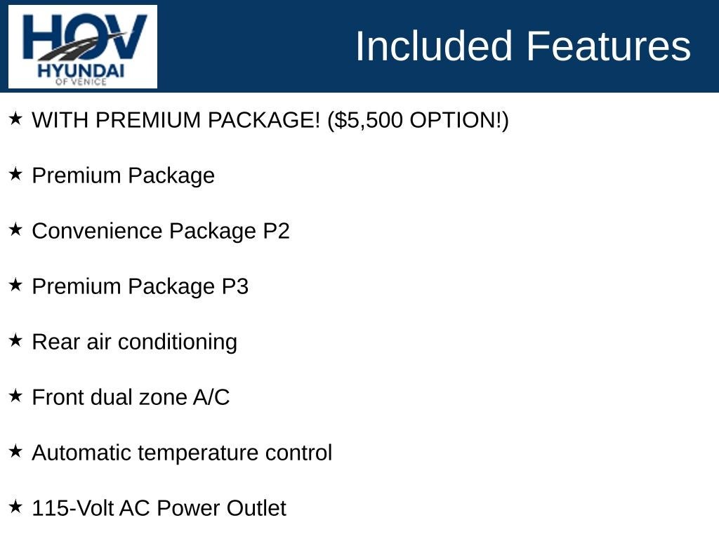 All pricing assumes dealer arranged financing on approved credit. Retired Loaner Vehicle pricing may include all factory rebates and incentives.. Hyundai of Venice Platinum Protection Plan of $1,295 and $995 CPO Inspection charge (CPO Units only) is not included. Hyundai of Venice also offers various programs periodically, which are mutually exclusive and cannot be combined with other offers. A Dealer Fee of $1299.00, Electronic Titling Fee of $599.95, Private Tag Agency fee of $298.00, and applicable taxes, tags, and government fees are not included in the listed prices. While we strive to represent each vehicle accurately, including color, equipment, and options, we recommend verifying all details before purchase, as we are not liable for errors or omissions. To receive any advertised pricing or specials, a copy of the advertisement must be presented at the time of purchase. All prices are for immediate sale and vehicles are sold first come first served. We do not accept deposits to hold used vehicles.