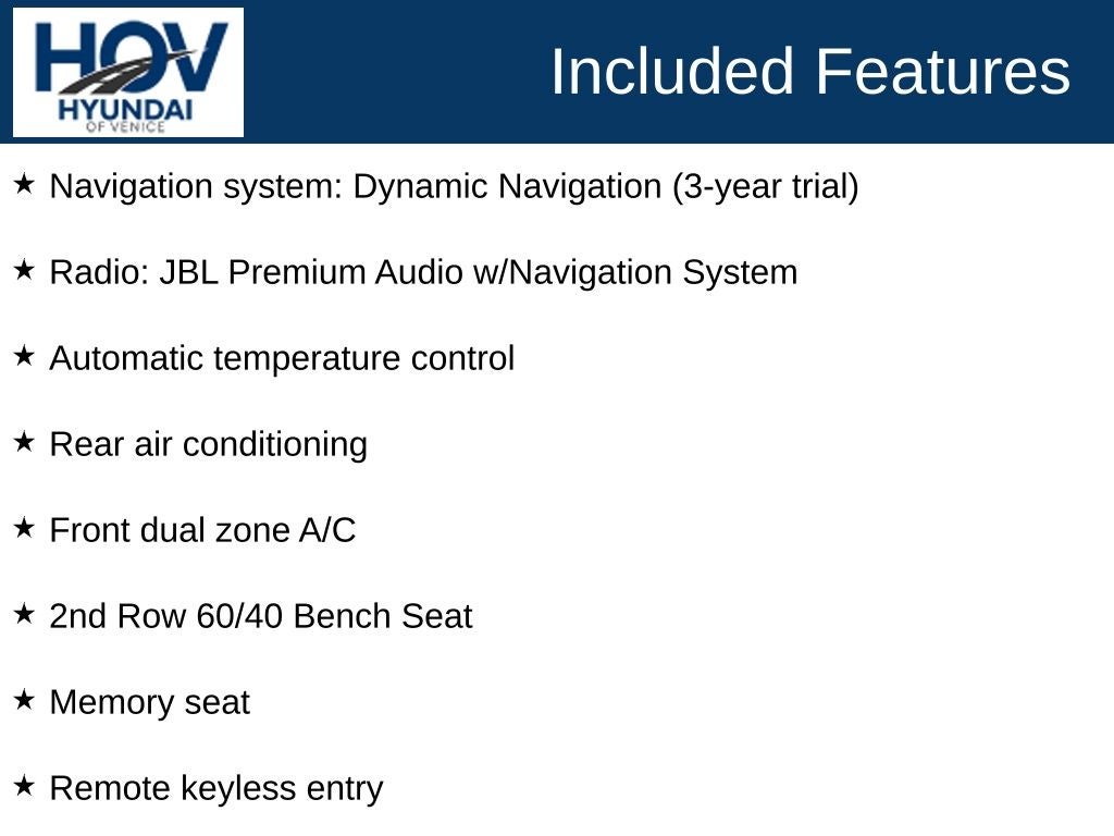 At Hyundai of Venice, we are committed to providing our customers with the best possible buying experience. All pricing assumes dealer-arranged financing on approved credit. The Hyundai of Venice Platinum Protection Plan of $1,295 and $995 CPO Inspection charge (CPO Units only) is not included. Hyundai of Venice also offers various programs periodically, which are mutually exclusive and cannot be combined with other offers. A Dealer Fee of $1299.00, Electronic Titling Fee of $599.95, Private Tag Agency fee of $298.00, and applicable taxes, tags, and government fees are not included in the listed prices. While we strive to represent each vehicle accurately, including color, equipment, and options, we recommend verifying all details before purchase, as we are not liable for errors or omissions. To receive any advertised pricing or specials, a copy of the advertisement must be presented at the time of purchase.