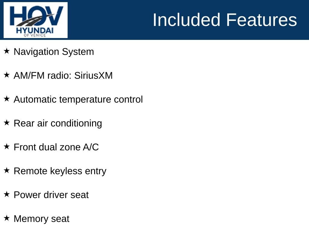 All pricing assumes dealer arranged financing on approved credit. Hyundai of Venice Platinum Protection Plan of $1,295 and $995 CPO Inspection charge (CPO Units only) is not included. Hyundai of Venice also offers various programs periodically, which are mutually exclusive and cannot be combined with other offers. A Dealer Fee of $1299.00, Electronic Titling Fee of $599.95, Private Tag Agency fee of $298.00, and applicable taxes, tags, and government fees are not included in the listed prices. While we strive to represent each vehicle accurately, including color, equipment, and options, we recommend verifying all details before purchase, as we are not liable for errors or omissions. To receive any advertised pricing or specials, a copy of the advertisement must be presented at the time of purchase.