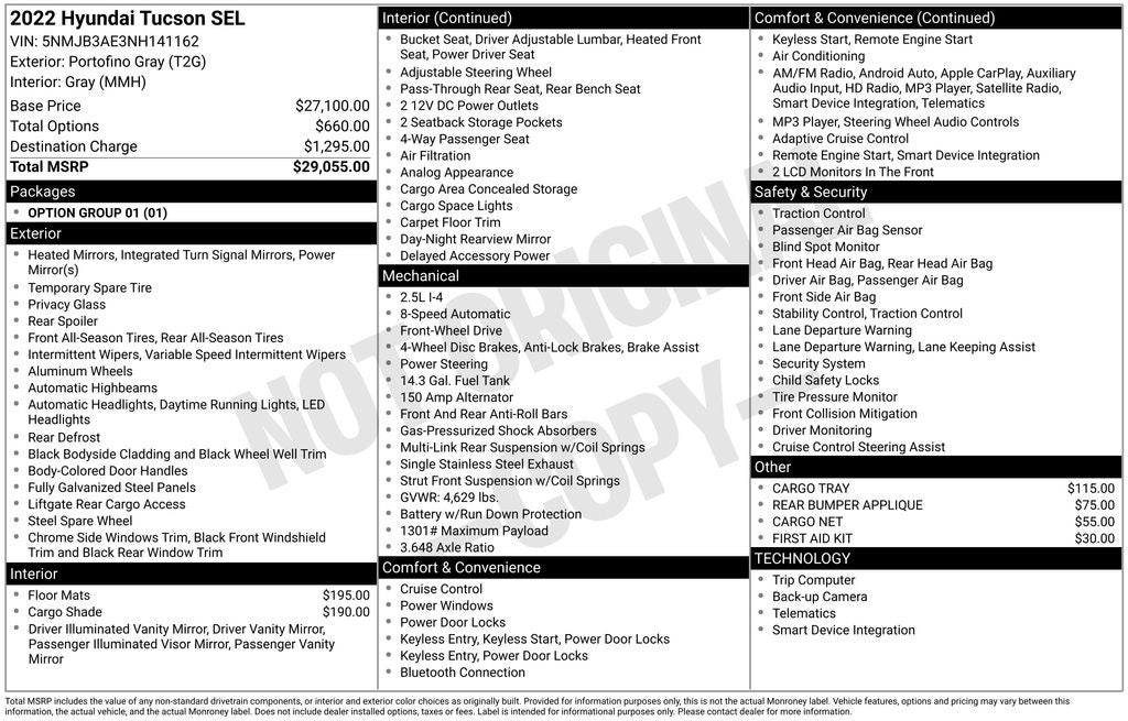 Certified. Portofino Gray 2022 Hyundai Tucson SEL Apple CarPlay & Android Auto, Auto High-beam Headlights, Delay-off headlights, Dual front impact airbags, Dual front side impact airbags, Fully automatic headlights, Occupant sensing airbag, Option Group 01, Overhead airbag, Power driver seat, Radio: AM/FM/HD/SiriusXM Audio System, Remote keyless entry, Steering wheel mounted audio controls, Telescoping steering wheel, Tilt steering wheel, Wheels: 17 x 7.0J Alloy. CARFAX One-Owner.
