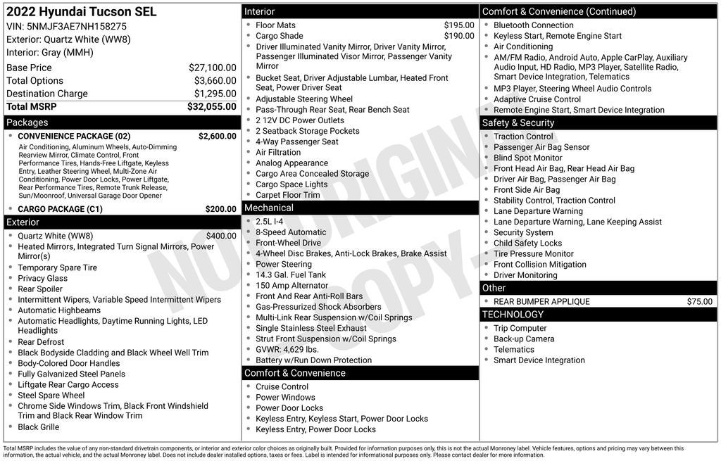 Certified. Quartz White 2022 Hyundai Tucson SEL 10.25 Digital Instrument Cluster, Apple CarPlay & Android Auto, Auto High-beam Headlights, Auto-Dimming Interior Mirror w/Homelink, Cargo Package, Convenience Package, Delay-off headlights, Dual Automatic Temperature Control, Dual front impact airbags, Dual front side impact airbags, First Aid Kit, Fully automatic headlights, Heated Front Bucket Seats, Occupant sensing airbag, Option Group 02, Overhead airbag, Power driver seat, Power Sunroof, Radio: AM/FM/HD/SiriusXM Audio System, Remote keyless entry, Steering wheel mounted audio controls, Wheels: 19 x 7.5J Machine-Face Finish Alloy. CARFAX One-Owner.
