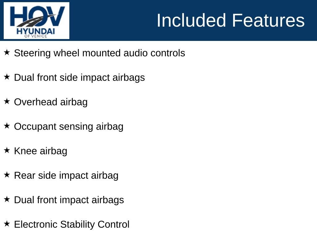All pricing assumes dealer arranged financing on approved credit. Hyundai of Venice Platinum Protection Plan of $1,295 and $995 CPO Inspection charge (CPO Units only) is not included. Hyundai of Venice also offers various programs periodically, which are mutually exclusive and cannot be combined with other offers. A Dealer Fee of $1299.00, Electronic Titling Fee of $599.95, Private Tag Agency fee of $298.00, and applicable taxes, tags, and government fees are not included in the listed prices. While we strive to represent each vehicle accurately, including color, equipment, and options, we recommend verifying all details before purchase, as we are not liable for errors or omissions. To receive any advertised pricing or specials, a copy of the advertisement must be presented at the time of purchase.