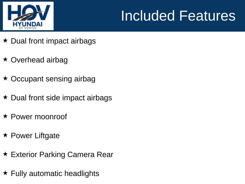 All pricing assumes dealer arranged financing on approved credit. Hyundai of Venice Platinum Protection Plan of $1,295 and $995 CPO Inspection charge (CPO Units only) is not included. Hyundai of Venice also offers various programs periodically, which are mutually exclusive and cannot be combined with other offers. A Dealer Fee of $1299.00, Electronic Titling Fee of $599.95, Private Tag Agency fee of $298.00, and applicable taxes, tags, and government fees are not included in the listed prices. While we strive to represent each vehicle accurately, including color, equipment, and options, we recommend verifying all details before purchase, as we are not liable for errors or omissions. To receive any advertised pricing or specials, a copy of the advertisement must be presented at the time of purchase.