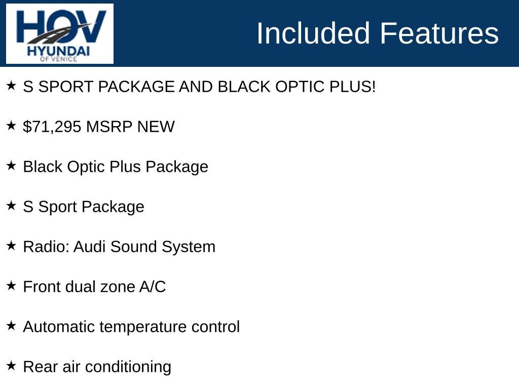 - Navigation Package -inc: MMI Navigation Plus, Traffic Sign Recognition, Audi Connect NAV & PLUS, Audi app store and 6-month trial subscription