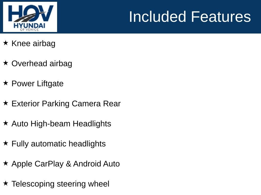 All pricing assumes dealer arranged financing on approved credit. Hyundai of Venice Platinum Protection Plan of $1,295 and $995 CPO Inspection charge (CPO Units only) is not included. Hyundai of Venice also offers various programs periodically, which are mutually exclusive and cannot be combined with other offers. A Dealer Fee of $1299.00, Electronic Titling Fee of $599.95, Private Tag Agency fee of $298.00, and applicable taxes, tags, and government fees are not included in the listed prices. While we strive to represent each vehicle accurately, including color, equipment, and options, we recommend verifying all details before purchase, as we are not liable for errors or omissions. To receive any advertised pricing or specials, a copy of the advertisement must be presented at the time of purchase.