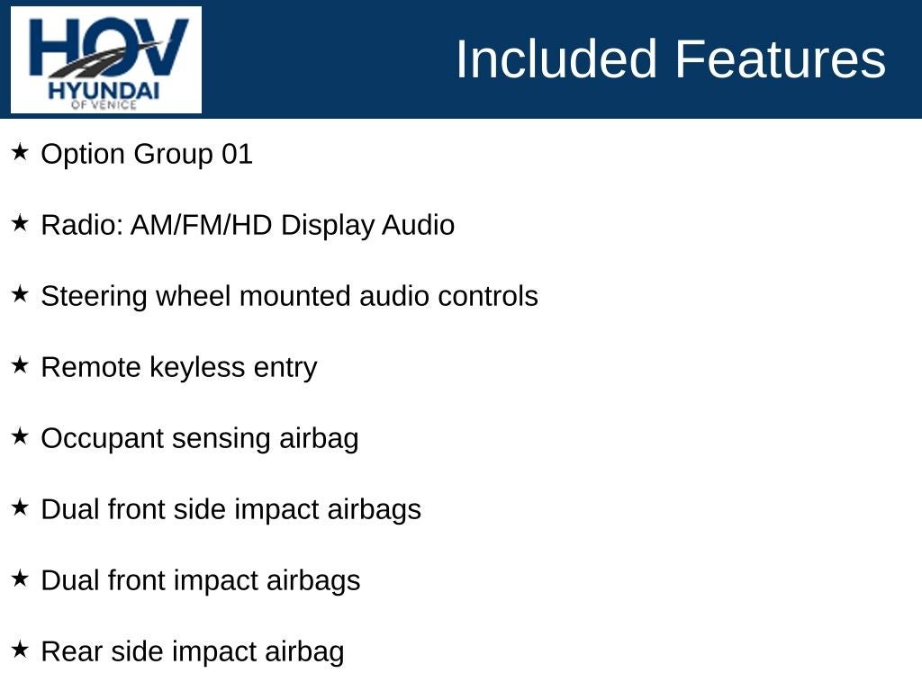 All pricing assumes dealer arranged financing on approved credit. Retired Loaner Vehicle pricing may include all factory rebates and incentives.. Hyundai of Venice Platinum Protection Plan of $1,495 and $995 CPO Inspection charge (CPO Units only) is not included. Hyundai of Venice also offers various programs periodically, which are mutually exclusive and cannot be combined with other offers. A Dealer Fee of $1299.00, Electronic Titling Fee of $599.95, Private Tag Agency fee of $298.00, and applicable taxes, tags, and government fees are not included in the listed prices. While we strive to represent each vehicle accurately, including color, equipment, and options, we recommend verifying all details before purchase, as we are not liable for errors or omissions. To receive any advertised pricing or specials, a copy of the advertisement must be presented at the time of purchase.
