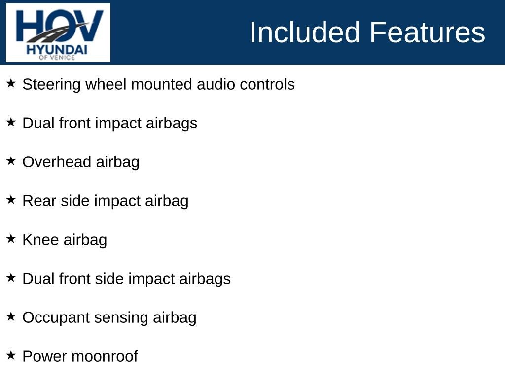 All pricing assumes dealer arranged financing on approved credit. Hyundai of Venice Platinum Protection Plan of $1,295 and $995 CPO Inspection charge (CPO Units only) is not included. Hyundai of Venice also offers various programs periodically, which are mutually exclusive and cannot be combined with other offers. A Dealer Fee of $1299.00, Electronic Titling Fee of $599.95, Private Tag Agency fee of $298.00, and applicable taxes, tags, and government fees are not included in the listed prices. While we strive to represent each vehicle accurately, including color, equipment, and options, we recommend verifying all details before purchase, as we are not liable for errors or omissions. To receive any advertised pricing or specials, a copy of the advertisement must be presented at the time of purchase.