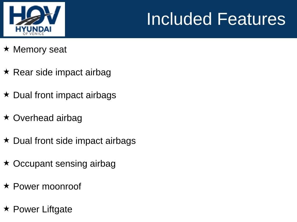 Visit our website at www.hyundaiofvenice.com for full pricing disclosures including required fees. Our new vehicles are priced using current market conditions and available manufacturer incentives to provide competitive, transparent pricing and include destination and handling and unless otherwise indicated, advertised prices INCLUDE $1,299 dealer fee, $599.95 electronic filing fee. $298 private tag agency fee, Tax, tag, title, registration are excluded. Optional dealer-installed products, including the Hyundai of Venice Platinum Protection Plan ($1,295), are not included in the advertised price unless otherwise stated and are always optional. Retired Loaners pricing may reflect available incentives or programs from Hyundai Motor Finance. Not all customers will qualify, and offers may not be combined. Please contact the dealership for complete details and eligibility requirements. While we make every effort to ensure accuracy in vehicle descriptions, pricing, equipment, and availability, we recommend verifying all information with a member of our team prior to purchase, as errors or omissions may occur. All vehicles are offered for immediate sale and are sold on a first-come, first-served basis. Due to high demand, we do not hold used vehicles with deposits. To ensure eligibility for any advertised price or promotion, please refer to the specific advertisement at the time of purchase.