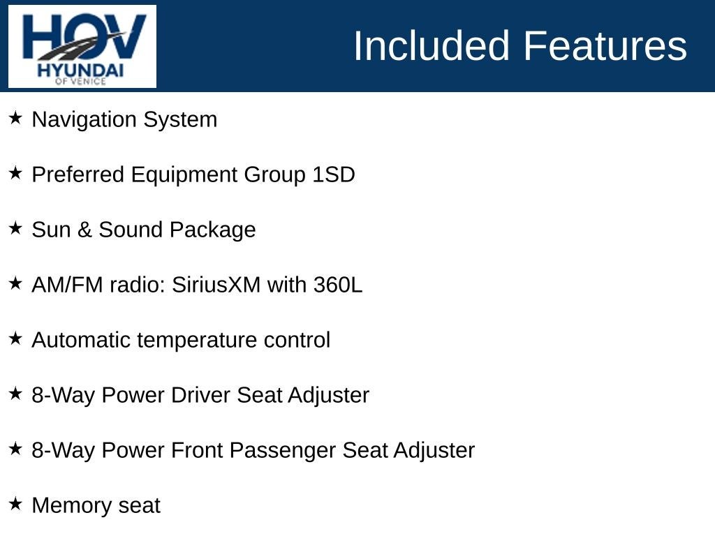 All pricing assumes dealer arranged financing on approved credit. Hyundai of Venice Platinum Protection Plan of $1,295 and $995 CPO Inspection charge (CPO Units only) is not included. Hyundai of Venice also offers various programs periodically, which are mutually exclusive and cannot be combined with other offers. A Dealer Fee of $1299.00, Electronic Titling Fee of $599.95, Private Tag Agency fee of $298.00, and applicable taxes, tags, and government fees are not included in the listed prices. While we strive to represent each vehicle accurately, including color, equipment, and options, we recommend verifying all details before purchase, as we are not liable for errors or omissions. To receive any advertised pricing or specials, a copy of the advertisement must be presented at the time of purchase.