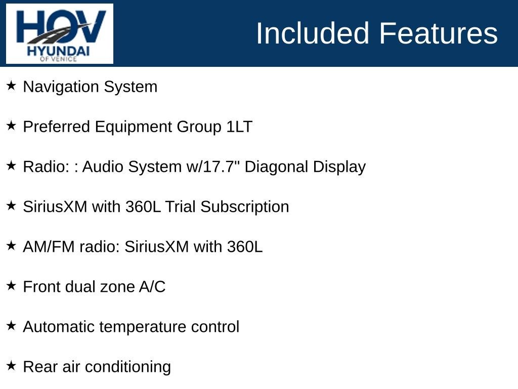 All pricing assumes dealer arranged financing on approved credit. Retired Loaner Vehicle pricing may include all factory rebates and incentives.. Hyundai of Venice Platinum Protection Plan of $1,495 and $995 CPO Inspection charge (CPO Units only) is not included. Hyundai of Venice also offers various programs periodically, which are mutually exclusive and cannot be combined with other offers. A Dealer Fee of $1299.00, Electronic Titling Fee of $599.95, Private Tag Agency fee of $298.00, and applicable taxes, tags, and government fees are not included in the listed prices. While we strive to represent each vehicle accurately, including color, equipment, and options, we recommend verifying all details before purchase, as we are not liable for errors or omissions. To receive any advertised pricing or specials, a copy of the advertisement must be presented at the time of purchase.