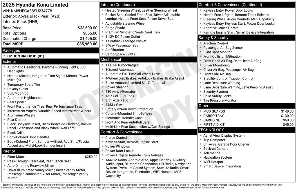Certified. Abyss Black Pearl 2025 Hyundai Kona Limited Apple CarPlay & Android Auto, Auto High-beam Headlights, Auto-dimming Rear-View mirror, Automatic temperature control, Delay-off headlights, Dual front impact airbags, Emergency communication system: Bluelink+, Front dual zone A/C, Fully automatic headlights, Heated & Ventilated Front Bucket Seats, Navigation System, Occupant sensing airbag, Option Group 01, Overhead airbag, Power driver seat, Power Liftgate, Power moonroof, Radio: AM/FM/HD Radio/SiriusXM w/Navigation, Remote keyless entry, Steering wheel mounted audio controls, Telescoping steering wheel, Tilt steering wheel, Wheels: 19 x 7.5J Glossy Black Alloy. CARFAX One-Owner. Clean CARFAX.