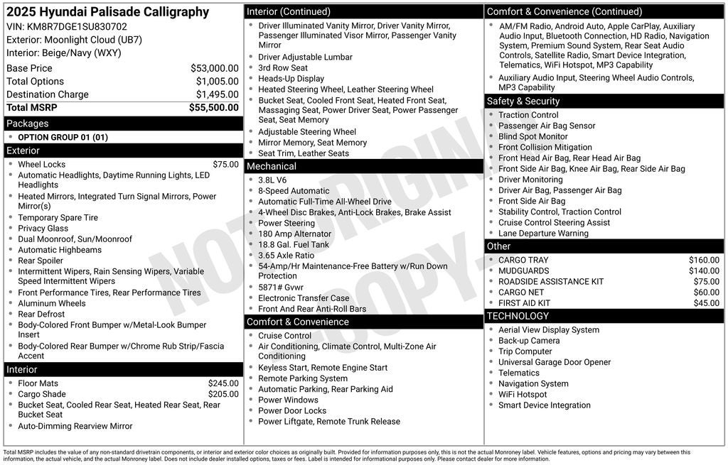 Certified. Moonlight Cloud 2025 Hyundai Palisade Calligraphy Beige/Navy Interior Package, very sought after combo!, Apple CarPlay & Android Auto, Auto High-beam Headlights, Auto-dimming Rear-View mirror, Auto-leveling suspension, Automatic temperature control, Dual front impact airbags, Dual front side impact airbags, Exterior Parking Camera Rear, Front dual zone A/C, Fully automatic headlights, harman/kardon® Speakers, Heated & Ventilated Front Bucket Seats, Knee airbag, Memory seat, Navigation System, Occupant sensing airbag, Option Group 01, Overhead airbag, Power driver seat, Power Liftgate, Power moonroof, Power passenger seat, Radio: AM/FM/MP3 Premium Audio System, Rain sensing wipers, Rear air conditioning, Remote keyless entry, Telescoping steering wheel, Tilt steering wheel, Wheels: 20 x 7.5J Calligraphy Exclusive Alloy. CARFAX One-Owner.