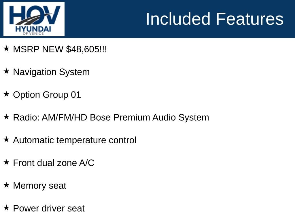 All pricing assumes dealer arranged financing on approved credit. Hyundai of Venice Platinum Protection Plan of $1,295 and $995 CPO Inspection charge (CPO Units only) is not included. Hyundai of Venice also offers various programs periodically, which are mutually exclusive and cannot be combined with other offers. A Dealer Fee of $1299.00, Electronic Titling Fee of $599.95, Private Tag Agency fee of $298.00, and applicable taxes, tags, and government fees are not included in the listed prices. While we strive to represent each vehicle accurately, including color, equipment, and options, we recommend verifying all details before purchase, as we are not liable for errors or omissions. To receive any advertised pricing or specials, a copy of the advertisement must be presented at the time of purchase.