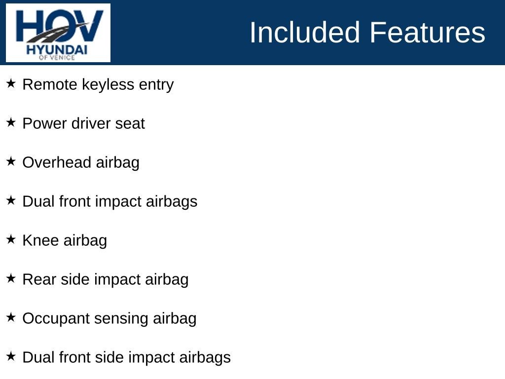 All pricing assumes dealer arranged financing on approved credit. Retired Loaner Vehicle pricing may include all factory rebates and incentives.. Hyundai of Venice Platinum Protection Plan of $1,295 and $995 CPO Inspection charge (CPO Units only) is not included. Hyundai of Venice also offers various programs periodically, which are mutually exclusive and cannot be combined with other offers. A Dealer Fee of $1299.00, Electronic Titling Fee of $599.95, Private Tag Agency fee of $298.00, and applicable taxes, tags, and government fees are not included in the listed prices. While we strive to represent each vehicle accurately, including color, equipment, and options, we recommend verifying all details before purchase, as we are not liable for errors or omissions. To receive any advertised pricing or specials, a copy of the advertisement must be presented at the time of purchase. All prices are for immediate sale and vehicles are sold first come first served. We do not accept deposits to hold used vehicles.