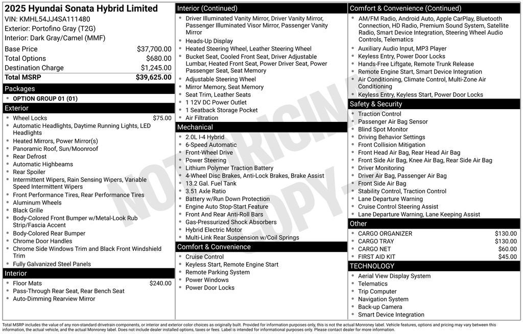 Certified. Portofino Gray 2025 Hyundai Sonata Hybrid Limited 17 x 7.0J Aluminum Alloy Wheels, Apple CarPlay & Android Auto, Auto High-beam Headlights, Auto-dimming Rear-View mirror, Automatic temperature control, Delay-off headlights, Dual front impact airbags, Dual front side impact airbags, Electronic Stability Control, Front dual zone A/C, Fully automatic headlights, Heads-Up Display, Heated & Ventilated Front Bucket Seats, Knee airbag, Lane Departure Warning System, Leather Seating Surfaces, Memory seat, Navigation System, Occupant sensing airbag, Option Group 01, Overhead airbag, Power driver seat, Power moonroof, Power passenger seat, Radio: AM/FM/HD/SiriusXM, Rain sensing wipers, Rear side impact airbag, Remote keyless entry, Steering wheel mounted audio controls. CARFAX One-Owner. Clean CARFAX.